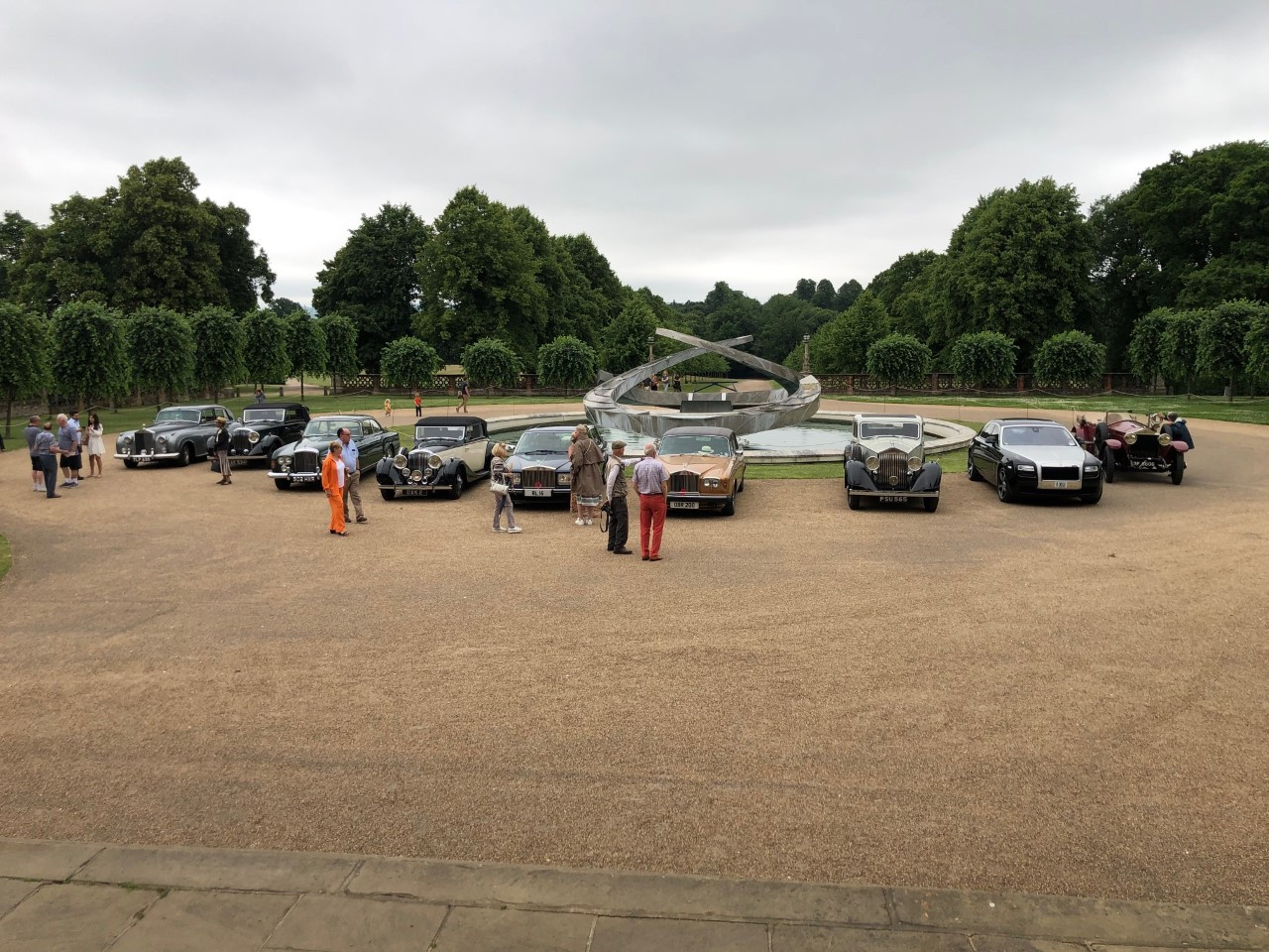 Members’ cars surrounding the modern water feature in the forecourt of Hatfield House