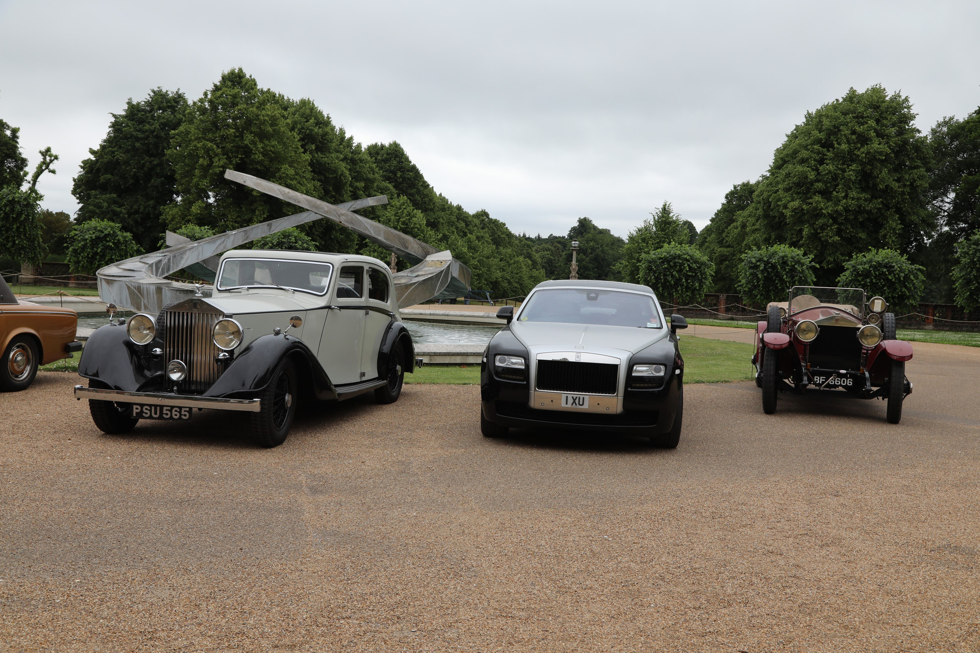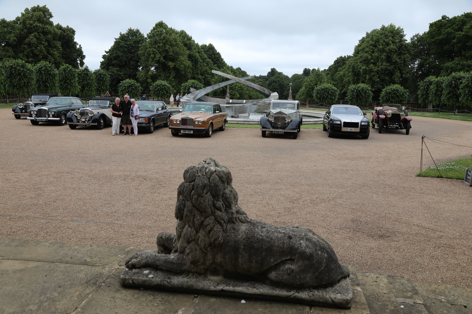 David Pearl’s 1956 Silver Cloud I 4dr saloon SDD82 being parked next to Richard Edgell’s Richard Edgell’s 1935 3½ litre James Young drophead coupé B56EF in the forecourt of Hatfield House